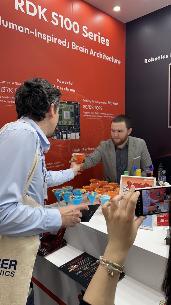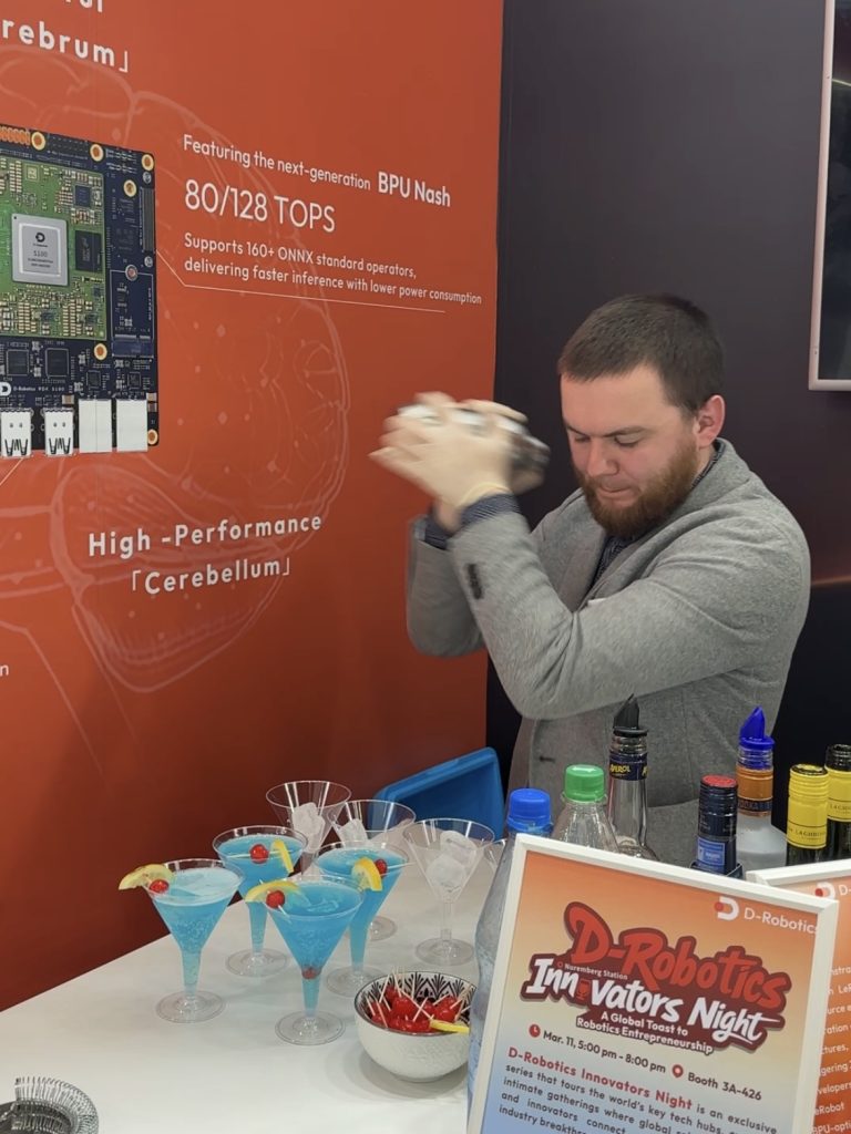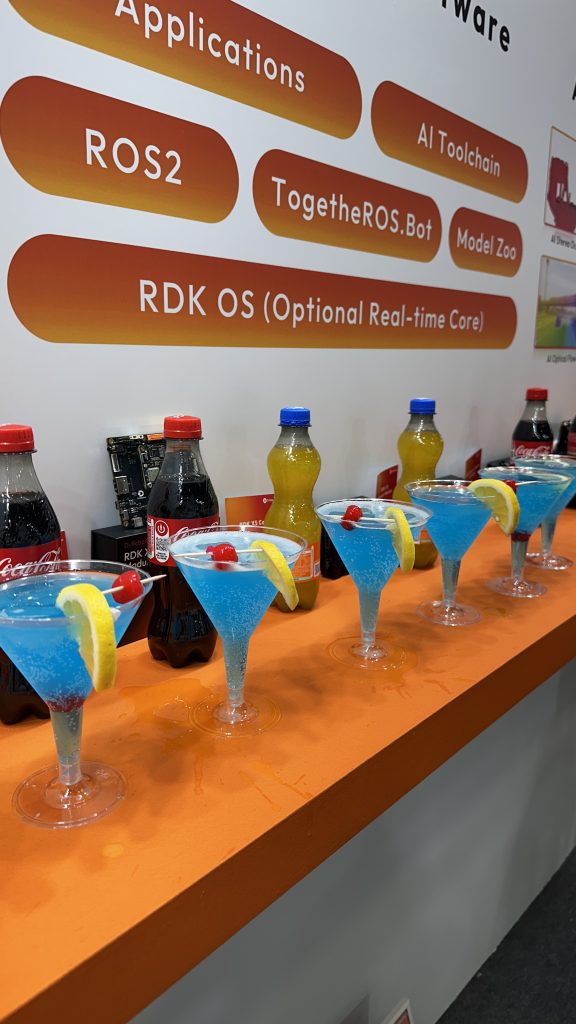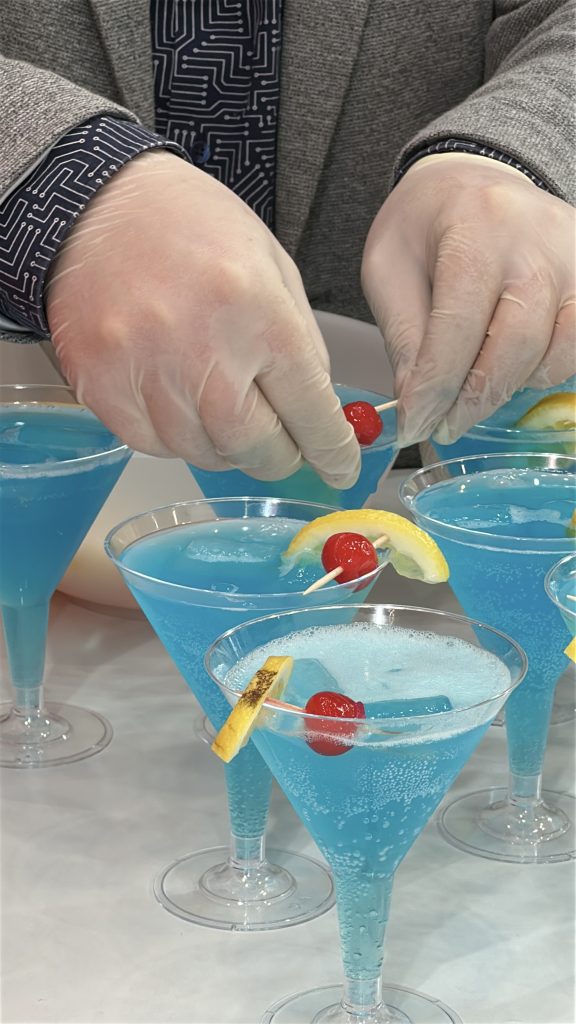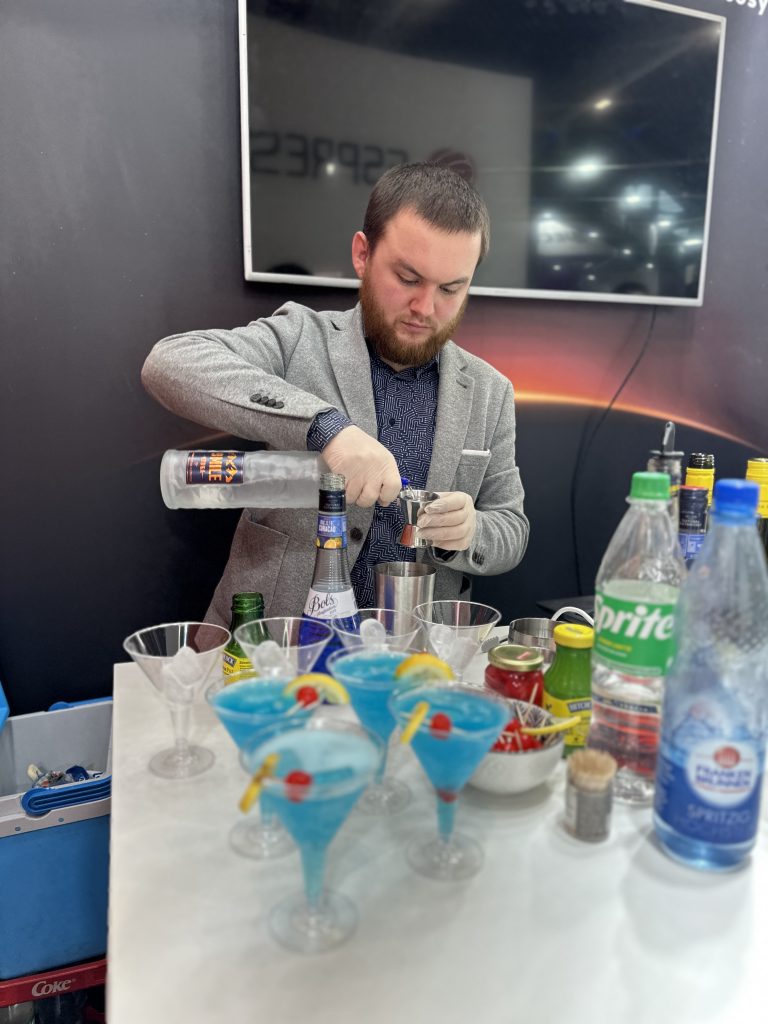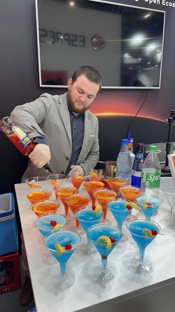 At one booth, Our bartenders – Marc served a selection of classic exhibition cocktails, including Aperol Spritz and a refreshing Blue Curacao-based drink with candied cherry garnish.
